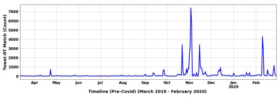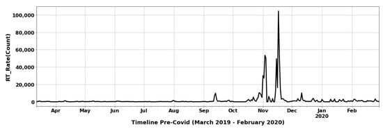 The metadata rt_created_at provides the moment when the last original tweet/retweet of a retweet has been posted. For original tweets, the value of rt_created_at would be null; otherwise, the moment information would be stored for retweets. Based on this feature, the original tweets & retweets posted during the pre-COVID-19 timeline are segregated. After segregation, a total of 222,779 original tweets (with repetition) & 744,995 retweets (with repetition) are found, which have been posted in the pre-COVID-19 timeline, i.e., April 2019 to February 2020. While analysing timeline-based retweet rates, it is evident from Figure 5 that the retweet rate started rising by the end of October 2019 and reached its peak in November & December 2019 due to the climb in concentration (Figure 6). Besides, it has been observed that around of the retweets are propagated from November 2019 to February 2019. Such observations clearly depict the association between the variation rate in levels and community awareness about pollution. Further, such awareness fosters environmental responsibility, encouraging positive change, the necessary course of action, criticism, etc. In addition to retweet rates, the tweet-retweet ratio evaluates the recurrence rate of an original tweet as retweeted through community posts. Here, the recurrence rate signifies a wide & rapid spread of a tweet as retweets across X/Twitter due to its content relevance with controversy, relativity, seeking actions, impactful text, etc., related to air quality in Delhi. Figure 7 shows that the increasing concentration levels from the end of October 2019 drive the recurrence rate. Original tweets influence the increasing number of users posting in the community because of the original tweets’ actionable insights, influential opinions, essential reports, criticisms, and many others. The monthly distribution of such virality of original tweets regarding recurrence rates is extracted in the pre-COVID-19 timeline. Table 4 depicts the top retweets propagated monthly on the pre-COVID-19 timeline. Note, this depiction indicates the transformation of the community’s intention towards considering highly engaging tweet contents based on the alterations in levels (discussed earlier in this Section) in the pre-COVID-19 timeline. Here, it can be perceived that the virality of the intentions relies upon the status of raw concentration at the timetable.