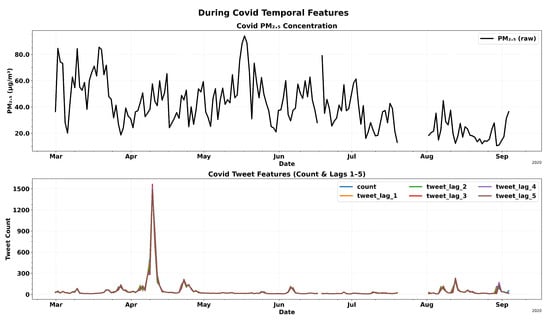 Temporal Features: There has been a lot of research carried out in the recent past, which shows the correlation between concentration levels and social media posts (X/Twitter, and Sina-Weibo) related to pollution at different geographic granularities. For instance, the authors in [33] have established significant associations for pollution-related posts of London, Delhi, Beijing, and many more. Such insights demonstrate the public concerns with the increasing rise of concentration, which serves as a proxy for air quality monitoring. Besides, through [13], it is evident that along with the inherent rise of social perception with the increase of , there has been a time drift between social perception on Twitter and actual ground truth (raw concentration of ). The reason is that social perception takes longer to form compared to chemical sensors employed in sensors. Considering such nature, tweet frequency lags, i.e., lag 1–5, have been regarded as features based on a day basis to shift the delay in social perception with sensory ground truth data. The temporal lag features are generated from the aggregated daily tweet counts to explore the relationship between X/Twitter community perception on social media and measured air quality. The lag feature represents the shifted value of the original time series, such that the information from prior days is used to explain present-day variation. In this study, the lagged variables were created for one to five days preceding the current observation, i.e., Lag 1 corresponds to the number of tweets posted one day prior, Lag 2 corresponds to two days prior, and so on up to Lag 5. The rationale for including lagged features is twofold. First, the human behavioural responses to changes in air quality are not instantaneous. For example, exposure to elevated levels may increase online discourse only after symptoms are felt or after media coverage disseminates the event. Second, from a modelling perspective, lagged features minimise the risk of temporal leakage by ensuring that only past user activity is used to interpret or forecast present air quality levels. Prior studies on temporal dynamics of social media have also indicated that event-related discussions often peak with a delay due to the diffusion of information across online networks. By incorporating daily tweet lags, we aim to capture these delayed behavioural patterns and assess their association with ground-truth pollution measurements at the RK Puram station in Delhi.
