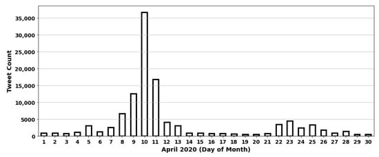 Here we are analysing the temporal and user-specific features from the COVID-19 tweet corpus to assess their impact on raw concentration. As it has already been analysed in studies [31,32] that the significant reduction in level took place in the first phase of covid in major Indian cities, which in turn reduces the community debate on pollution & climate change and climate policies. However, the intensity of community engagement regarding tweet count, community intents on tweets, user authenticity, and tweet recurrence rates should be evaluated to analyse their associations with the alterations in level at the COVID-19 timeline. It can be observed from Figure 8 that the concentration level has declined from March 2020 and climbed in between May & June 2020, but no more than . Likewise, the community engagement in frequency & lags can be observed, which is also low across the timeline except for mid-April 2020, where a sharp peak can be observed. Table 5 shows the monthly distribution of tweet count & mean concentration level at the COVID-19 timeline, i.e., March to September 2020. An unreasonable climb can be observed in community engagement regarding tweet frequency in April 2020, although the concentration is low. Further, the tweet frequency for April 2020 is observed daily as shown in Figure 9. It can be noticed that the majority of the tweets are propagated on 9–11 April 2020. Following that, the repetitions in that duration are discarded, and 4746 unique tweets have been received. It is evident from tweets that most intents were suggestions, i.e., propagating ideas, advice, recommendations, etc., related to the pandemic outbreak & reduced pollution. However, comparatively fewer intents related to praise & complaint are observed in community engagement. This observation also remains consistent across the covid timeline. A few example tweets related to the intents propagation on 9–11 April 2020 are depicted in Table 6.