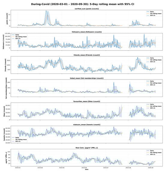 Figure 10 depicts the patterns related to user features, i.e., count of followers, verified, listed, favourite, etc., with concentration on a daily basis. Like in Figure 4, to reduce the day-to-day variability and highlight underlying patterns, we added the 5-day rolling mean with the 95% confidence interval for each feature for clearer visualisation of the temporal trends and the uncertainty around them. Here also, it is evident that except for the ‘verified’ count, the other user features do not immediately impact concentration. Therefore, the utility of user authenticity needs to be analysed. From Table 7, it is evident that the majority of verified & non-verified users were active on April 2020, resulting in around and of the total tweets (with repetition) posted that month, irrespective of the low concentration level. However, for other months, the engagement of verified and non-verified users adheres to the relativity with the low concentration level. These behavioural patterns are observed due to several facts & reports published related to the sharp decline of and improvement in NAAQS (https://www.thehindu.com/news/cities/Delhi/delhi-pollution-halved-during-first-phase-of-lockdown-cpcb/article31419356.ece, https://timesofindia.indiatimes.com/city/delhi/despite-lockdown-pm2-5-as-high-as-two-years-ago/articleshow/83793790.cms accessed on 19 August 2025). for several days, which drives the community to engage in discussions. The impact of retweet rates and tweet-retweet ratio is analysed for March–September 2020 and specifically in the timeline of April 2020 using rt_created_at. The utility of rt_created_at has already been discussed earlier in this Section. The original tweets and retweets made within the COVID-19 period are now separated depending on this feature. After separation, a total of 59,417 original tweets (with repetition) & 147,457 retweets (with repetition) are found that have been posted in the covid timeline, i.e., March–September 2020. From Figure 11a,b, it is evident that the retweet rate also has climbed at its peak on April 2020 irrespective of low concentration level (Table 7). Around of overall retweets (with repetition) are posted this month. Note, such observations clearly show a little reliance on the community’s engagement in the discussions on the reports or facts related to the reduction in the air quality index. Such discussions mostly surround general awareness, hopes, and the course of action to keep pollution levels low. The recurrence rate of original tweets as retweets has been depicted in Figure 11c,d. Here, the increasing community influence of original tweets is observed in April 2020. The monthly distribution of recurrence rates has been extracted from the COVID-19 timeline.