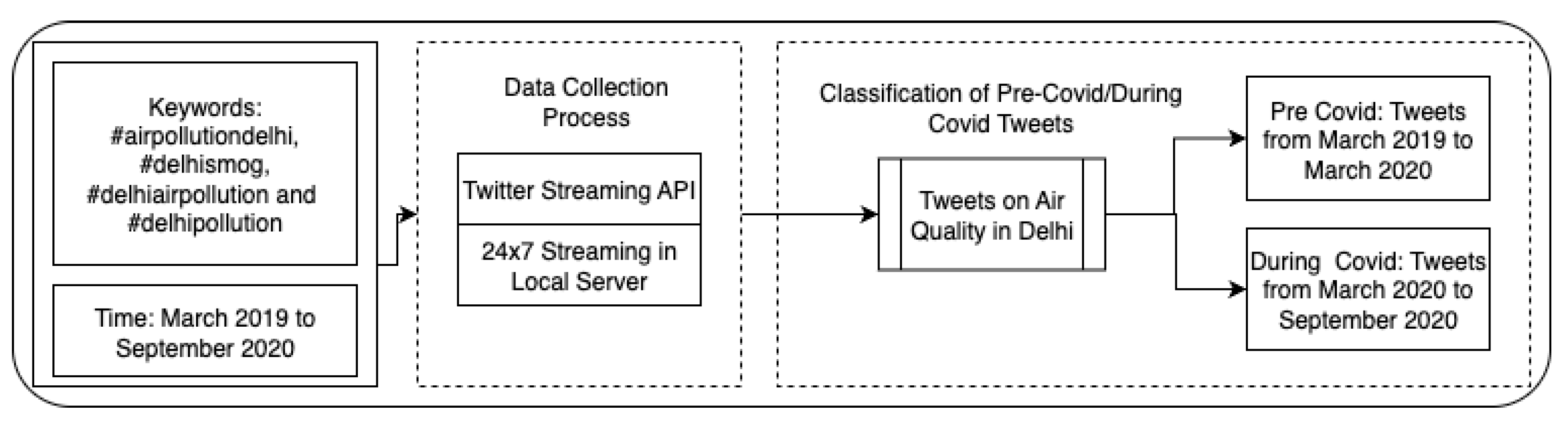 Considering severe air pollution in Delhi, hashtags such as #airpollutiondelhi, #delhismog, #delhiairpollution, and #delhipollution gained significant traction on Twitter as air quality levels worsened dramatically. The increase in pollution adversely impacts residents of both urban and suburban regions, resulting in a substantial surge of tweets that rapidly turn these hashtags into trending topics. The initial phase of our analytical framework involved collecting tweets related to air pollution from Twitter. For this purpose, we used Twitter’s Streaming API with the Researcher Access API (