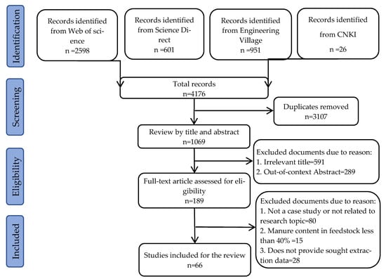 Finally, full-text articles were reviewed, and those not meeting the eligibility criteria were excluded. As a result, 66 studies using LCA methods to evaluate the environmental impacts of manure AD systems were included in the analysis.