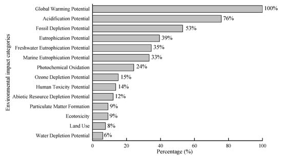 - Environmental impact indicators: This refers to the environmental impact indicators evaluated in each study along with their corresponding values. Indicators assessed in more than 5% of the studies are presented in Figure 3.