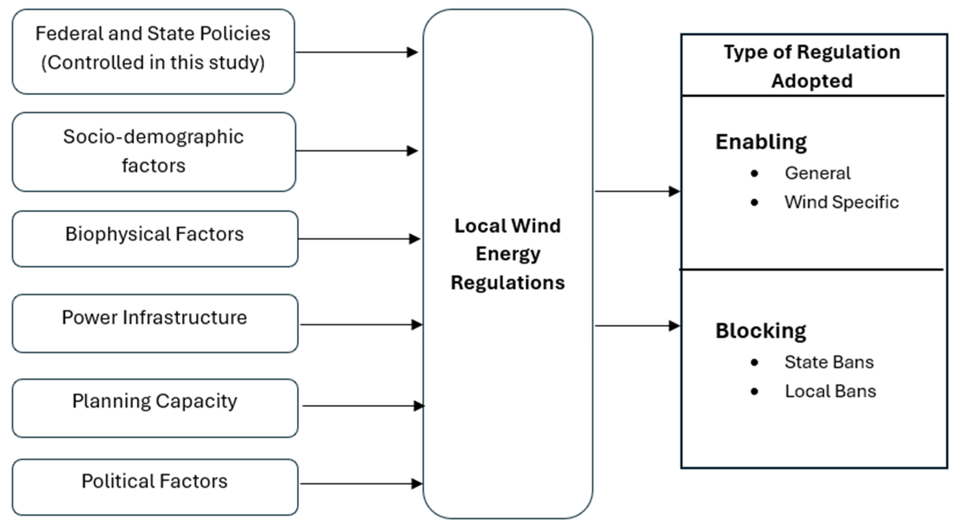 Figure 2. Federal and state policies, socio-demographic factors, biophysical factors, power infrastructure, planning capacity, and local political factors may drive the adoption of local wind regulations and variations in the types of regulations adopted. In turn, this framework leads us to develop research questions from the conceptual framework (