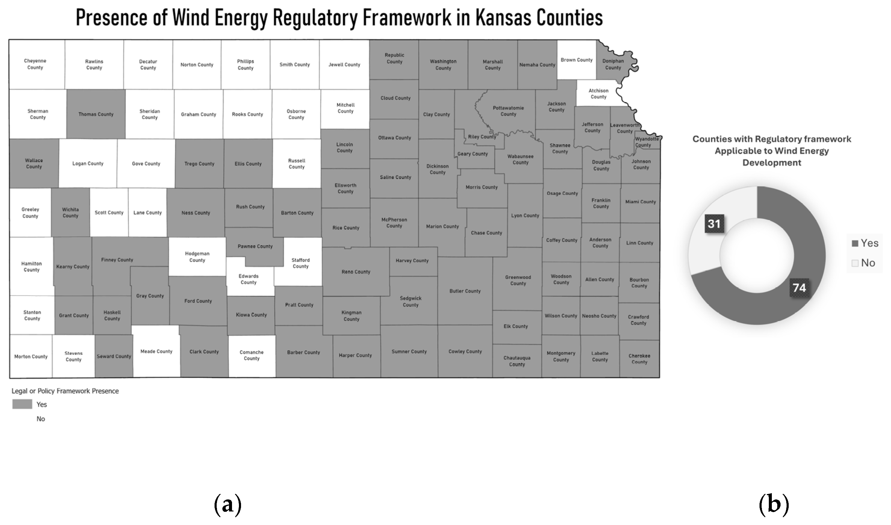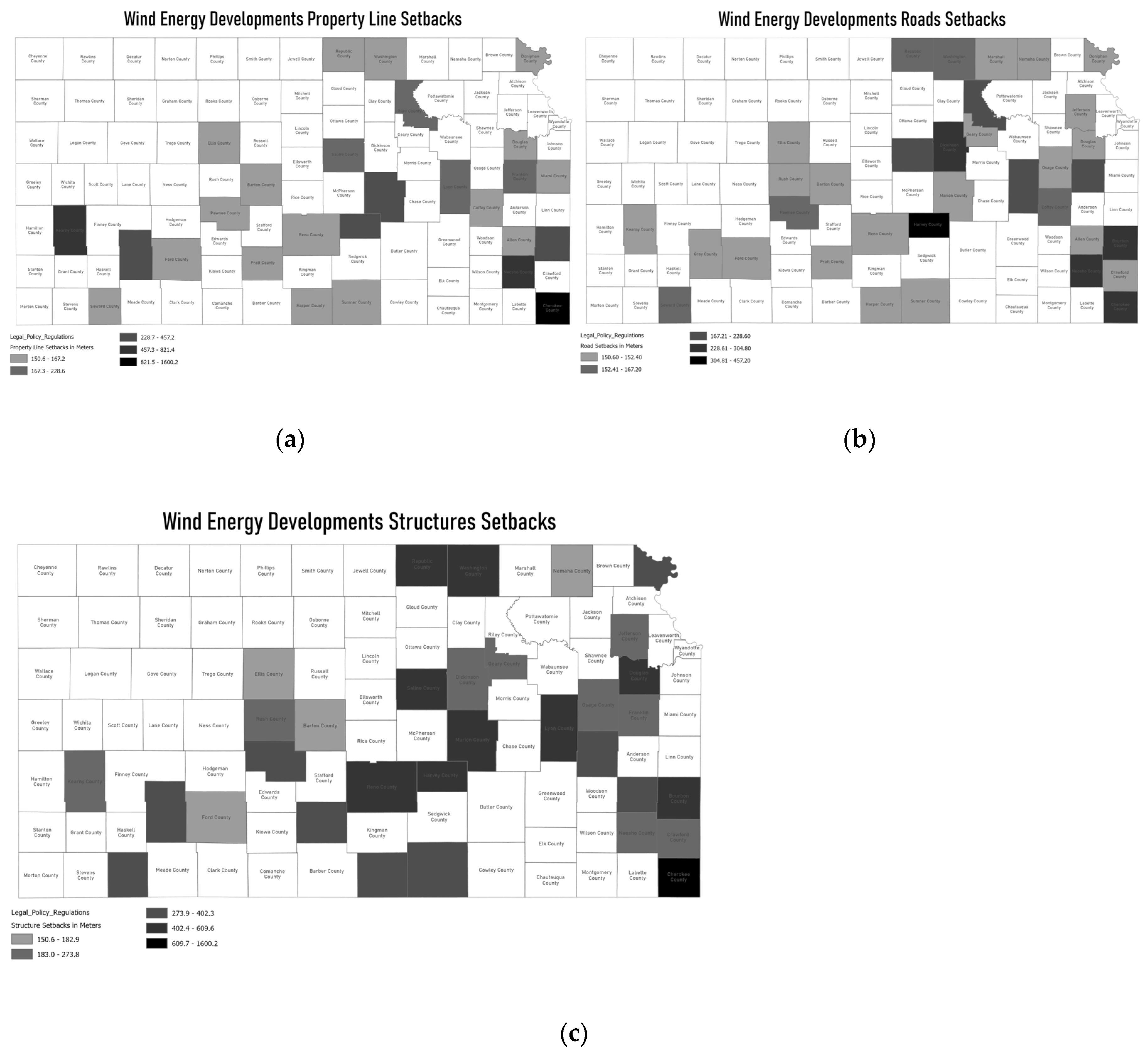 Figure 3a,b, the counties with no wind regulations generally align into two spatial groups: a handful of eastern counties, mostly along the border with Missouri. The second cluster is western counties, especially in northwestern Kansas and along the Colorado border.