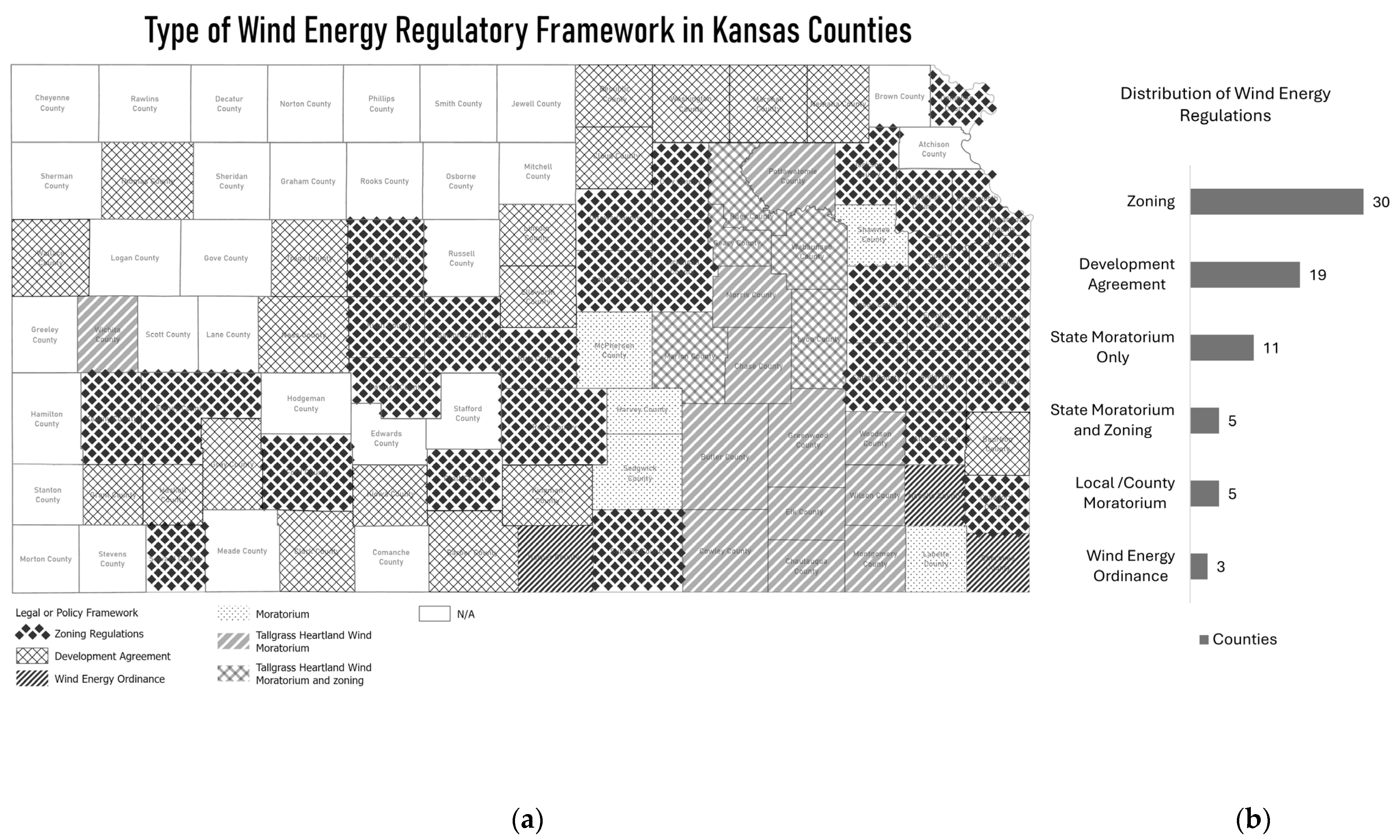Figure 4a,b), we note the wide swath of counties in east-central Kansas subject to the Tallgrass Heartland Wind Moratorium (THWM). These 11 counties comprise 15% of the 74 Kansas counties with some form of wind regulation. Again, this swath of counties prohibits wind installations based on state activity that was initiated in 2011, reaffirmed in 2020, and tends to have bipartisan support. Five additional counties are part of the THWM and have zoning regulations. The six additional counties with moratoria (8% of the 74 counties) consist of three counties along the I-135 corridor from Wichita to Salina, just west of the THWM swath, as well as Shawnee County, which contains Topeka and is just east of the THWM, and two lower population eastern Kansas counties. Together, these counties represent the group we consider to be engaged in blocking actions, a combined 19 counties, which is nearly 20% of the 105 total counties.