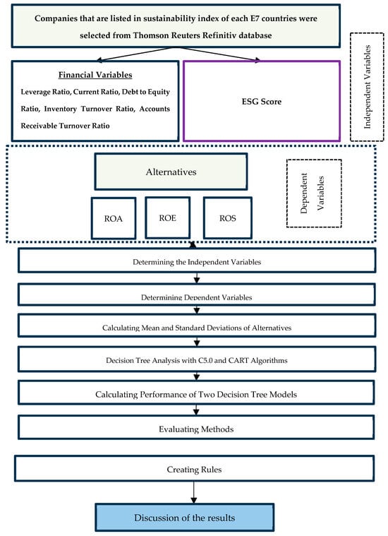 The decision tree is a classifier whose graphical structure analyzes samples based on a set of features and labels, classifies and regresses the samples, and presents the classification results in the form of a dendrogram [31]. In this study, the decision tree model was selected for the research. This is because the performance evaluation of companies is a relatively complex process. Many independent variables are difficult to model using linear regression, given the assumed performance criterion, and the normal distribution assumption is often difficult to meet. The study’s methodological approach distinguishes itself from traditional econometric models by employing the C5.0 Decision Tree model, a machine learning algorithm. This method aims to provide a deeper understanding of how ESG factors impact corporate performance by more effectively analyzing complex and non-linear relationships. The C5.0 Decision Tree model provides a clearer understanding of the thresholds in determining the role of ESG scores on companies’ financial performance metrics. The findings aim to provide valuable information to companies in the E7 countries on developing their current situations to turn into sustainability-focused strategies and improving their corporate performance. It also highlights the importance of ESG integration for policymakers in achieving sustainable development goals.