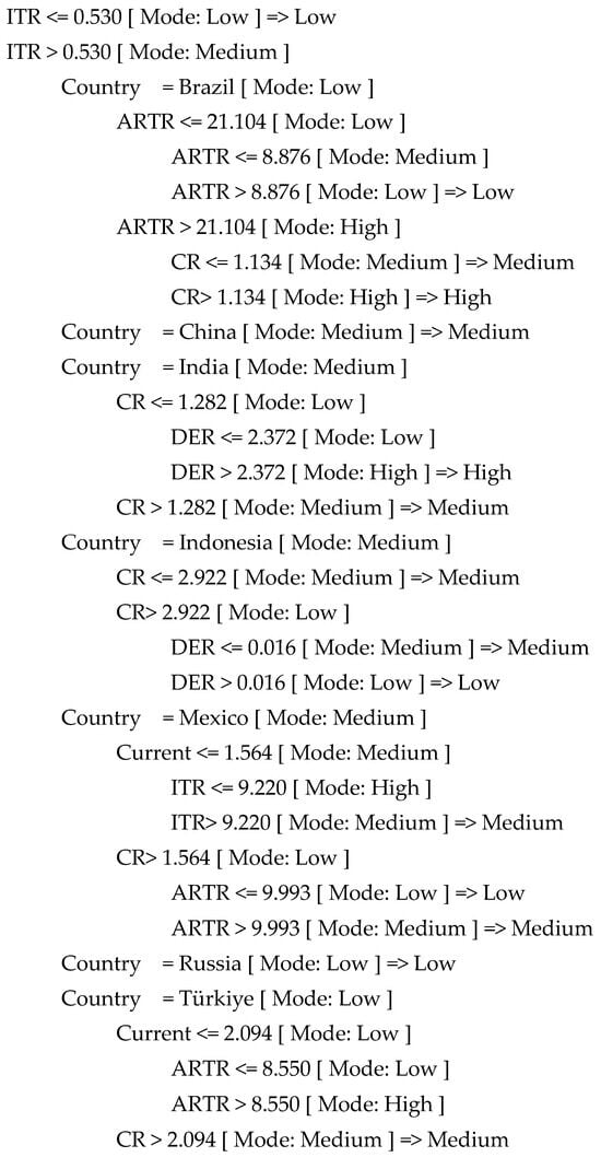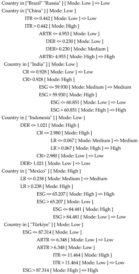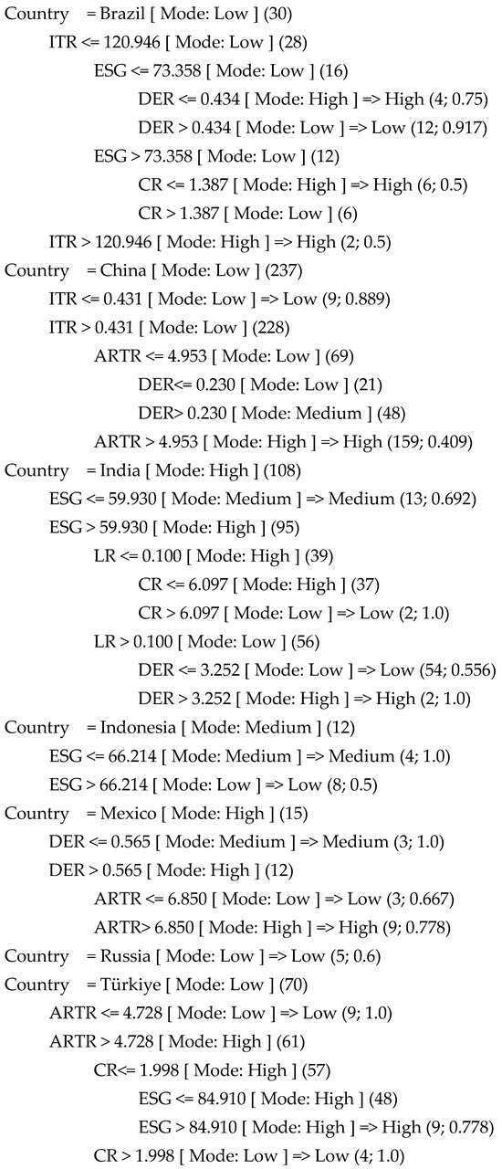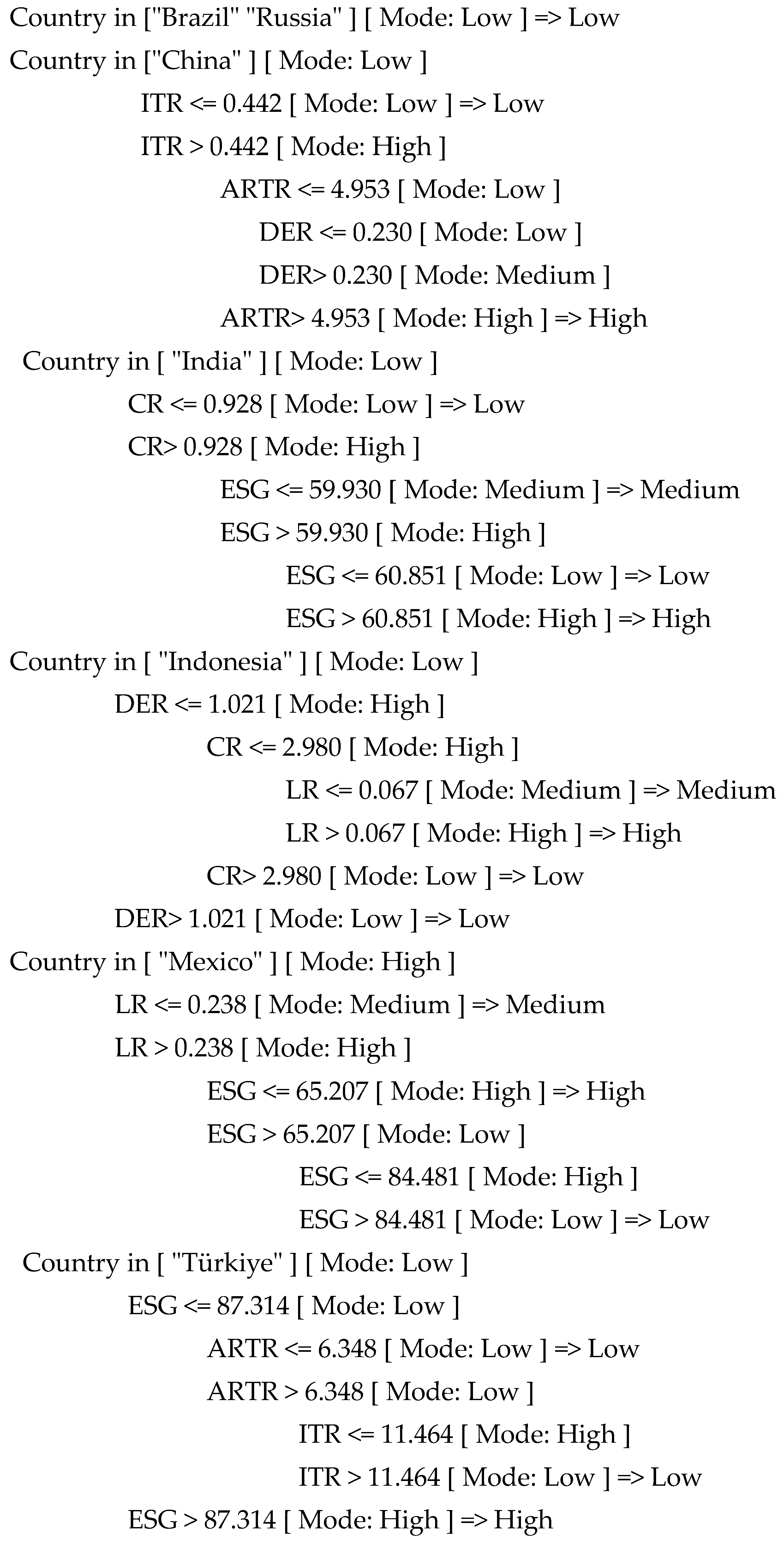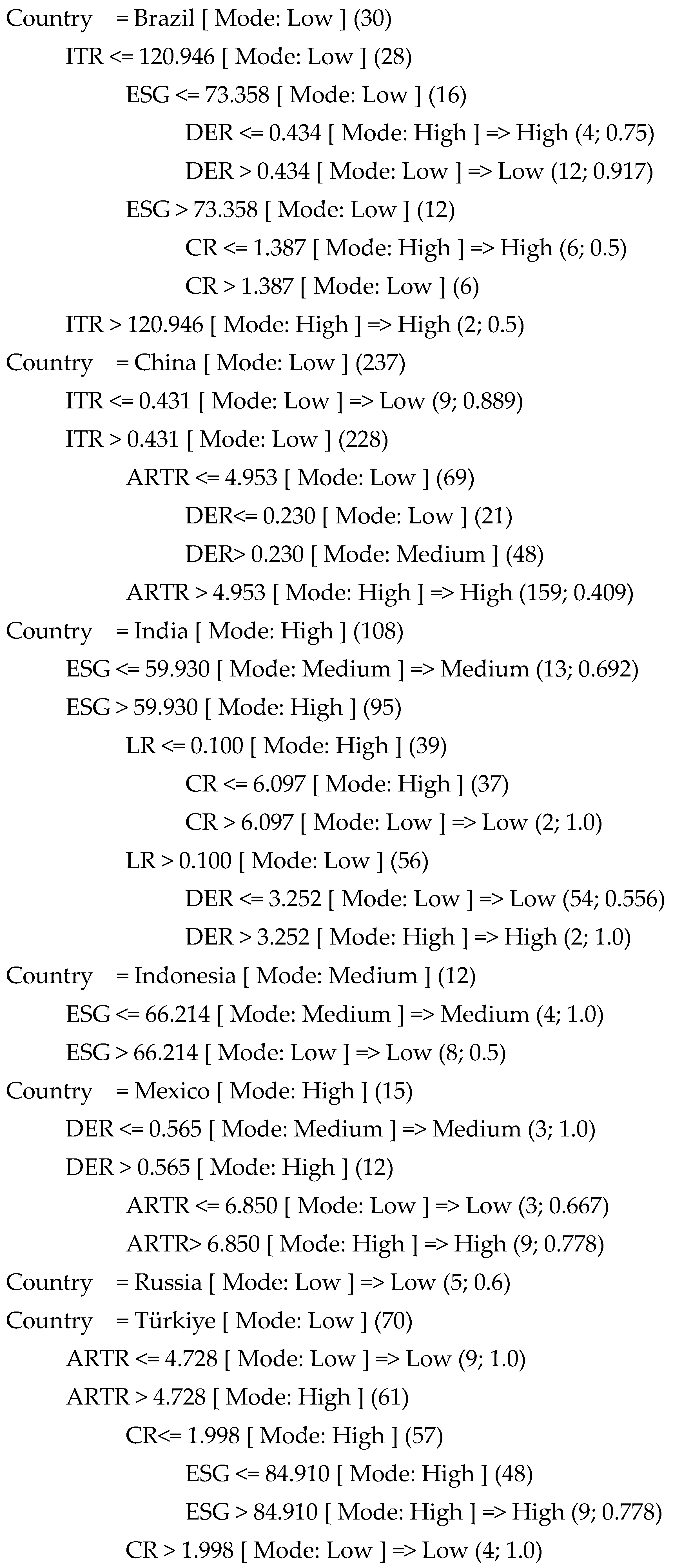 The method evaluates all independent data (ESG scores and financial variables) simultaneously and selects the variable that provides the greatest information gain at each step. Instead of assuming a linear relationship between variables, the C5.0 algorithm determines the cut-off points for continuous variables (such as ESG scores and financial variables) that best separate company performance categories. These thresholds are not predetermined by the researcher but emerge directly from the data. The hierarchical structure of the decision trees, along with the determination of the rules, naturally captures the interactions between ESG scores and financial variables. In other words, it reveals how the impact of a company’s sustainability practices varies depending on its financial situation. Adding “country” as a category to the algorithm allows us to determine whether ESG impacts apply to all E7 economies or whether they vary systematically across countries. This provides important information about the role of institutional and economic context.