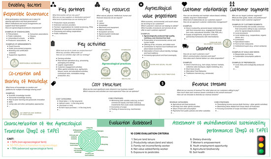 Moreover, for both internal strategic management and external communication, it would be beneficial to assess how much agroecological is a BM under analysis or development and what multidimensional sustainability outcomes it generates. Such evaluation aspects can be effectively addressed through TAPE, which provides a standardized, yet flexible methodology grounded in the 10 EAs to measure the degree of agroecological transition and the sustainability performance of farms, which can be applied across diverse farming systems and contexts [85]. Therefore, the ABMC integrates two additional components to show, respectively, the farm’s stage along an agroecological transition continuum, and its performance in terms of environmental, social, and economic sustainability. These aspects can be assessed through TAPE’s two main analytical phases: Step 1 and 2. The conceptual foundations, methodology, and operational protocols of TAPE are thoroughly detailed in FAO [73] and further elaborated in Mottet et al. [74].