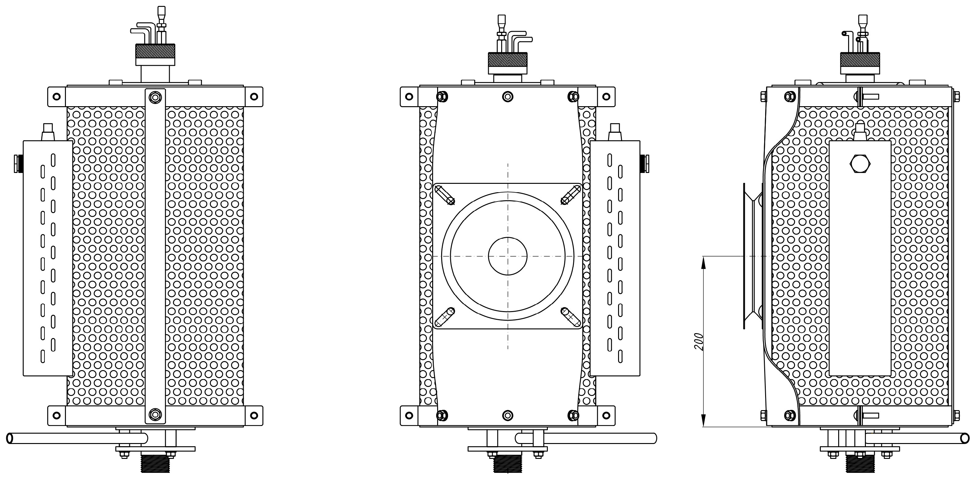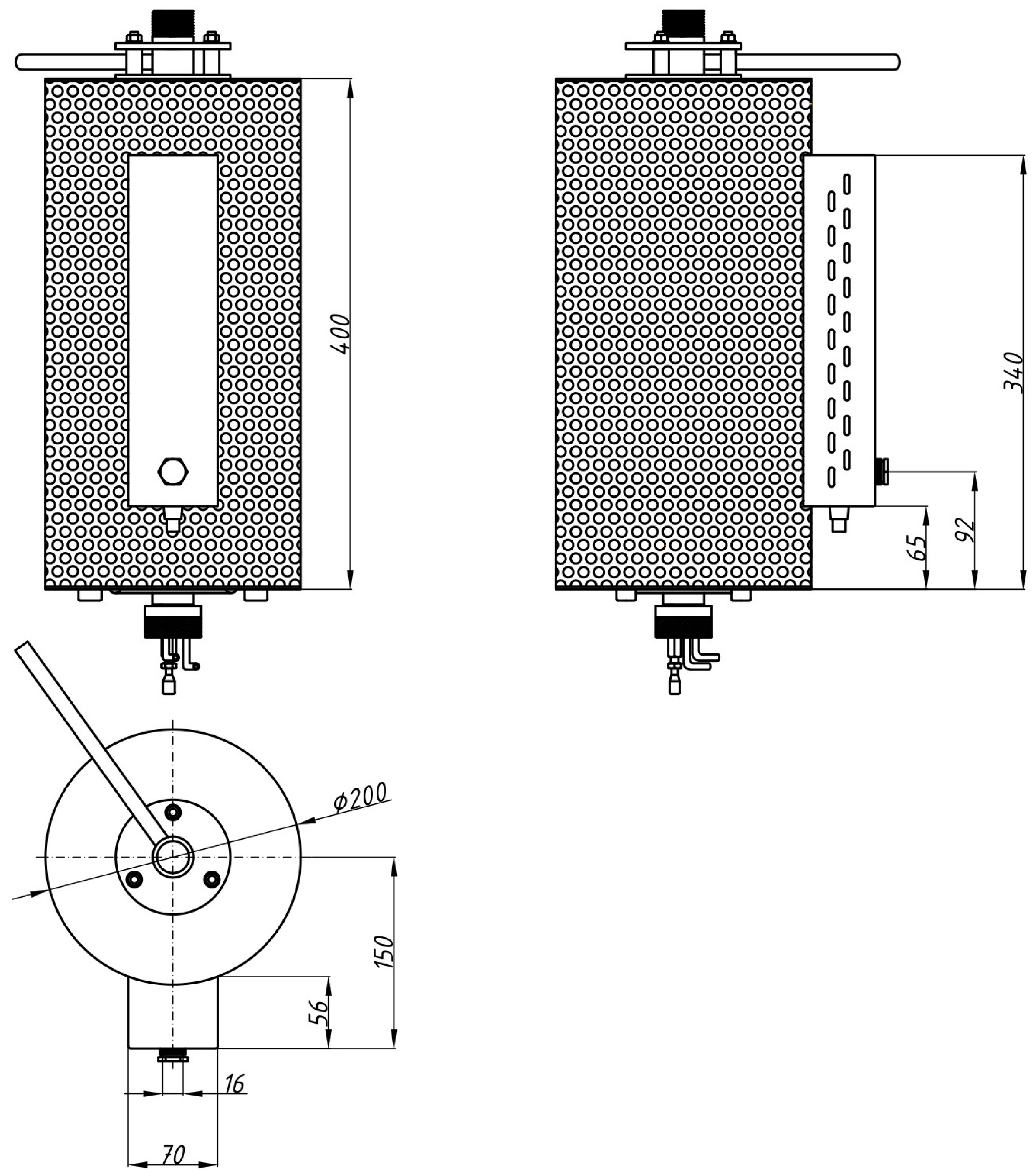 The outer surface of the furnace is carefully insulated with ceramic fiber-based rings, minimizing heat loss and stabilizing the internal temperature. The entire furnace casing is constructed from high-quality stainless steel, providing mechanical robustness and long-term reliability [41]. Figure 2 presents the basic dimensions of the tube furnace module and its individual components in top, side, and cross-sectional views.