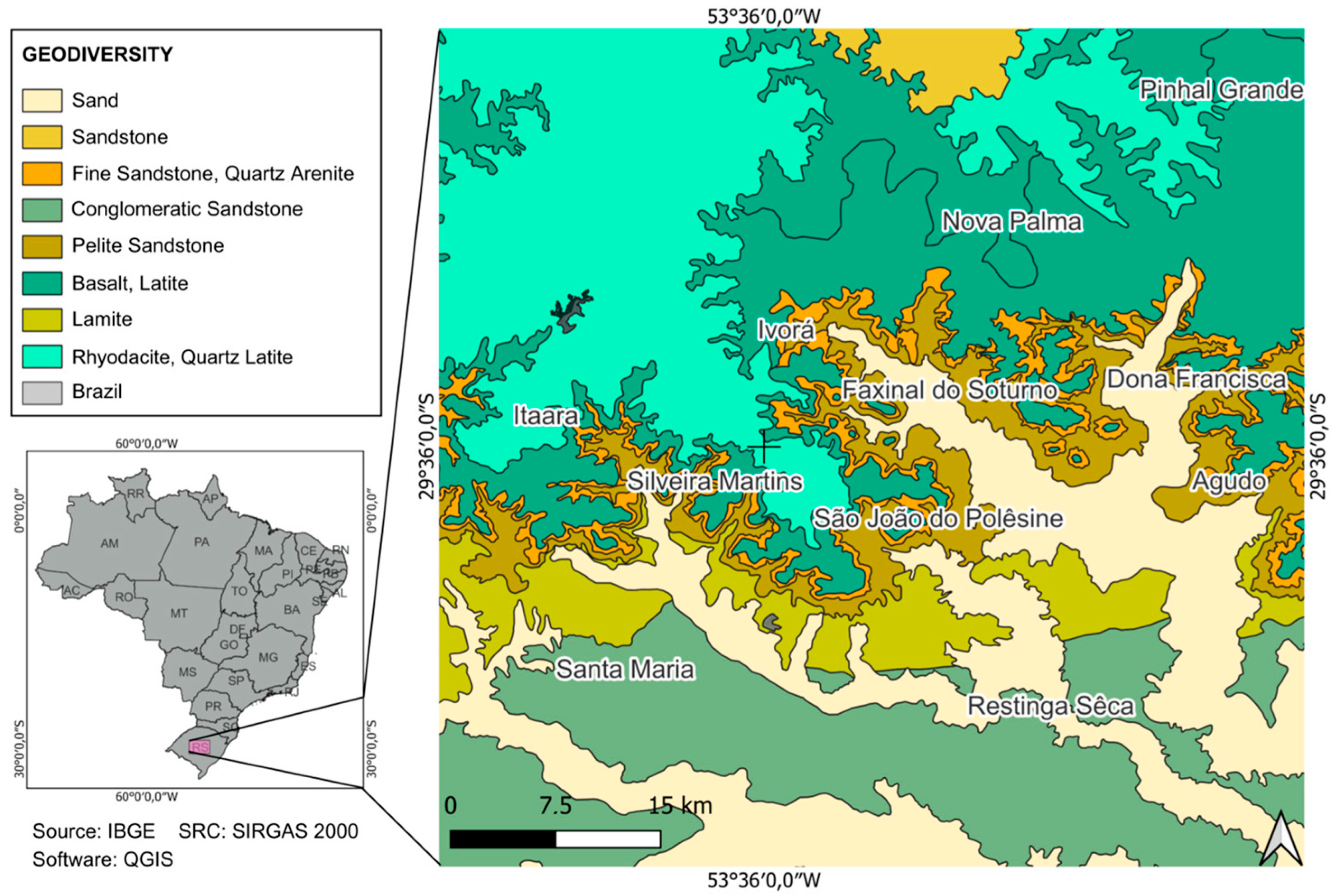 - Cardozo, E.S.; Souza, E.G.; Romani, R.F.; Escobar, C.C.; Nadaleti, W.C.; Vieira, B.M.; Pinto, V.M. The potential of volcanic rocks from the Serra Geral Group to soil remineralization. Rev. De Geociências Do Nordeste 2024, 10, 229–236. [Google Scholar] [CrossRef]