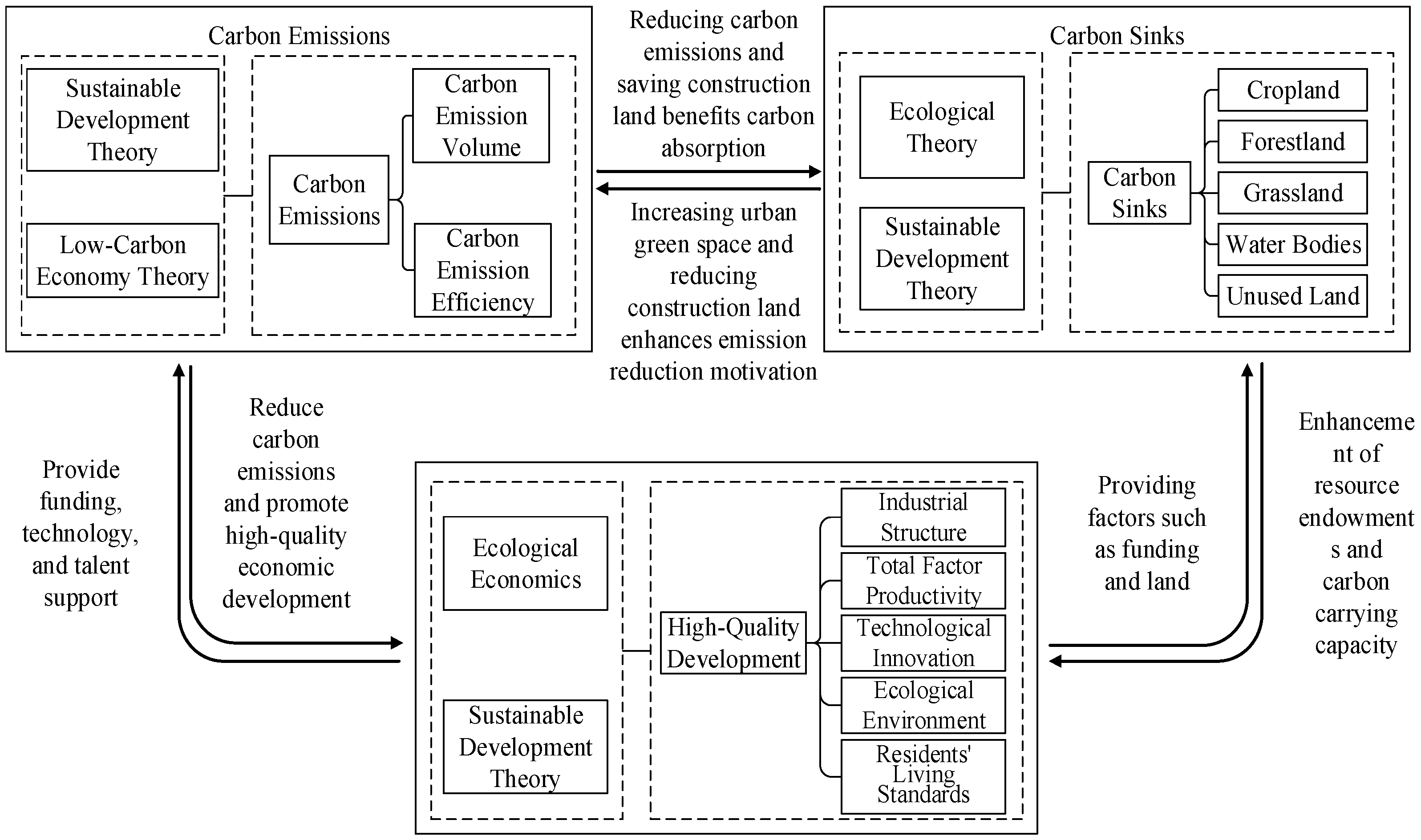 2.2. Coupling Mechanism Analysis of Carbon Emissions, Carbon Sinks, and High-Quality Development