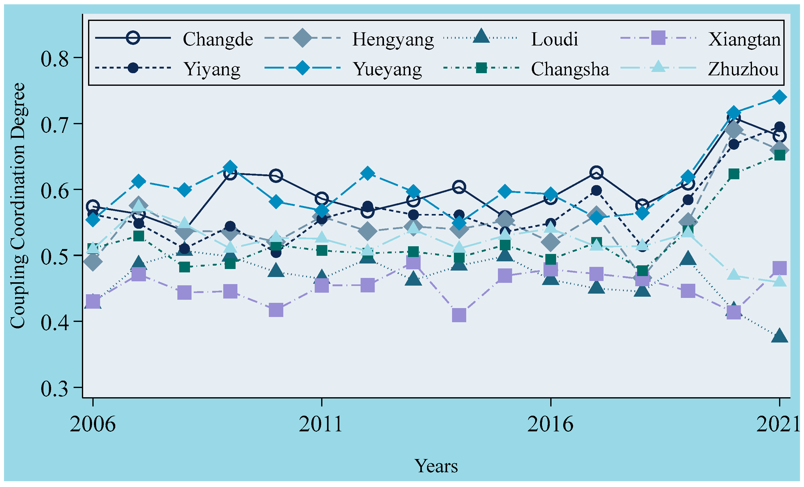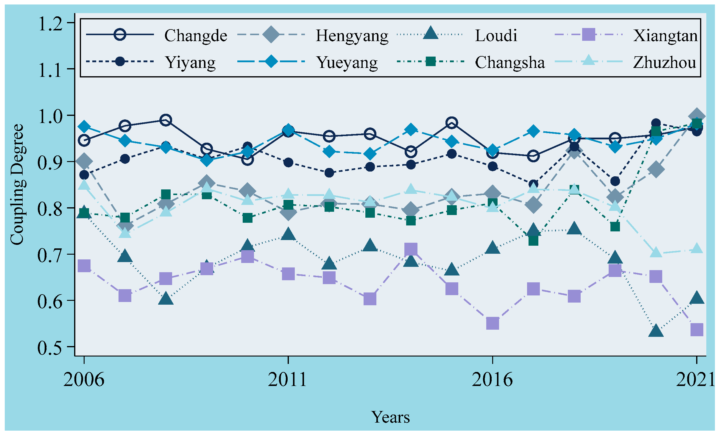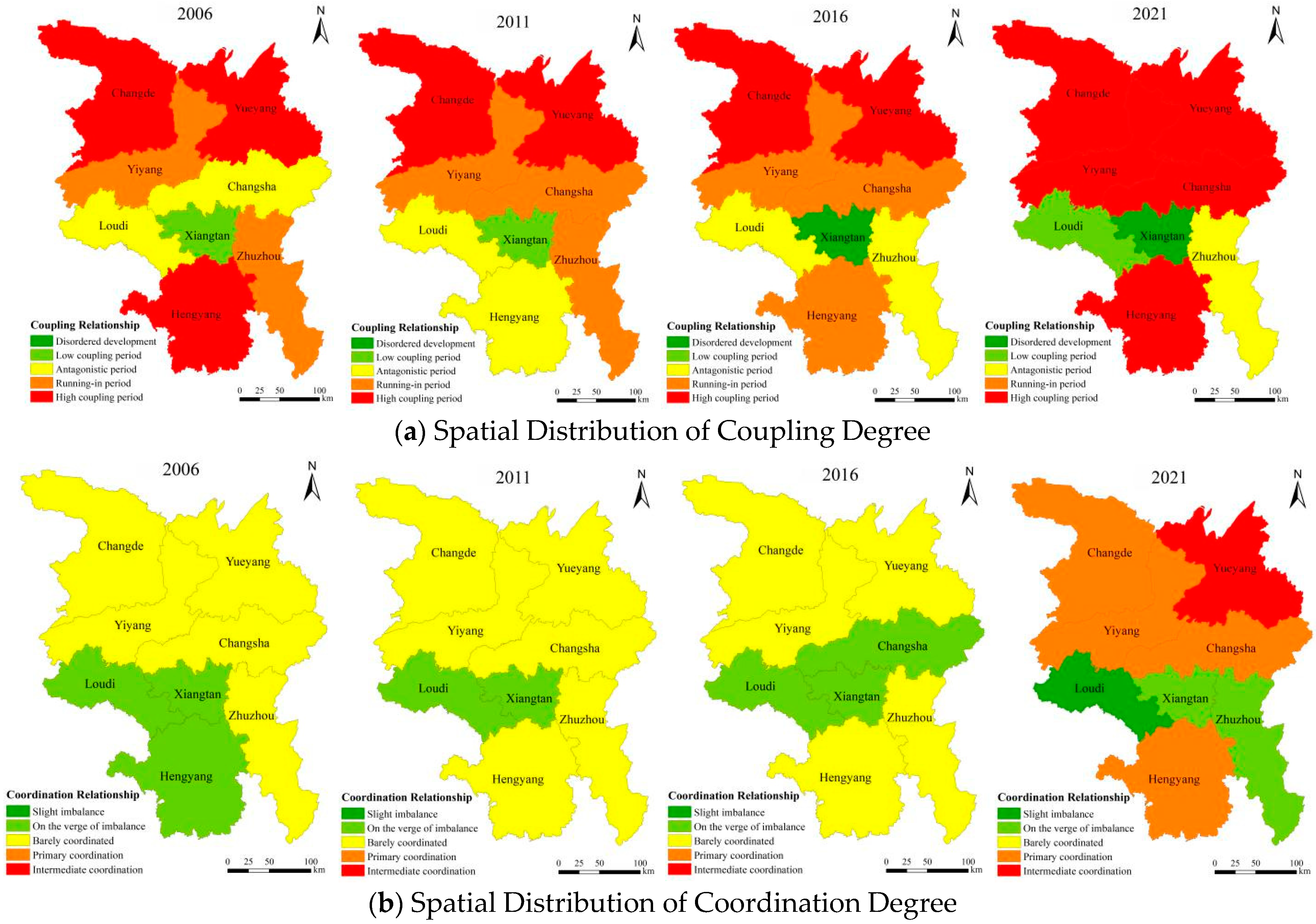 4.1. Spatiotemporal Evolution of Three-Dimensional Coupling Coordination