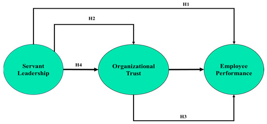 Servant leaders prioritize the needs and concerns of their employees, creating a sense of inclusion and belonging that strengthens teamwork, organizational commitment, and performance outcomes. Previous studies confirm the positive impact of SL on organizational outcomes, particularly its influence on employee performance (EP) [5,6,7]. Though SL has been studied significantly, how SL impacts EP is still not fully understood because we do not yet understand the mediating role of organizational trust (OT) in dynamic and emergent contexts. This evident gap in the literature is what this study seeks to address. However, the mechanisms through which SL shapes performance remain underexplored. In particular, the mediating role of organizational trust (OT) warrants deeper examination [8,9], especially in industries characterized by rapid technological advancements, environmental uncertainty, and competitive pressures such as telecommunications.