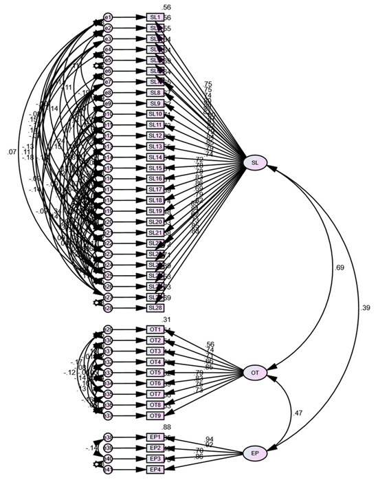 Confirmatory factor analysis (CFA) was conducted to validate the measurement model and ensure that each construct was represented by a unidimensional set of indicators. Using AMOS version 24, the analysis assessed convergent validity through standardized factor loadings, average variance extracted (AVE), and composite reliability (CR). Following the recommendations of Awang [48] and Hair et al. [47], convergent validity is established when factor loadings are substantial, AVE values exceed 0.50, and CR values are greater than 0.60. The results indicated that all constructs in this study satisfied these criteria, thereby confirming their reliability and validity. As shown in Figure 2, the CFA model demonstrates the relationships between the latent variables (SL), (OT), and (EP)—and their observed indicators. The figure highlights the strong standardized loadings of items on their respective constructs, visually supporting the robustness of the measurement model.