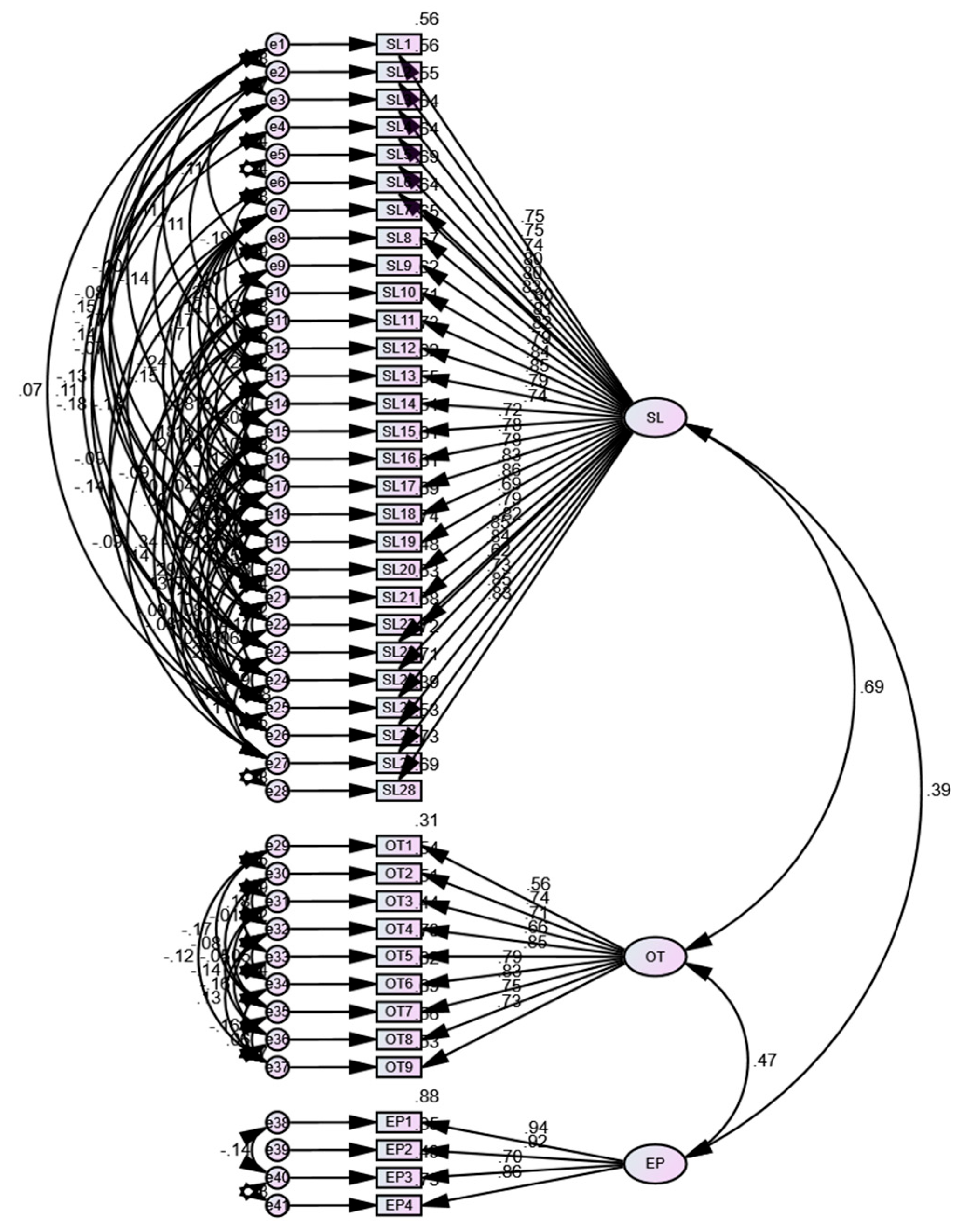 The detailed results of the CFA are summarized in Table 4. SL was measured through 28 items with loadings ranging from 0.623 to 0.859, yielding a CR of 0.979 and an AVE of 0.63. OT was assessed using 9 items with loadings between 0.557 and 0.854, producing a CR of 0.914 and an AVE of 0.55. EP was captured with 4 items that loaded between 0.698 nand 0.940, with a CR of 0.917 and an AVE of 0.74. These values collectively demonstrate high internal consistency and strong convergent validity across the three constructs. In addition to convergent validity, model fit was examined using multiple indices.