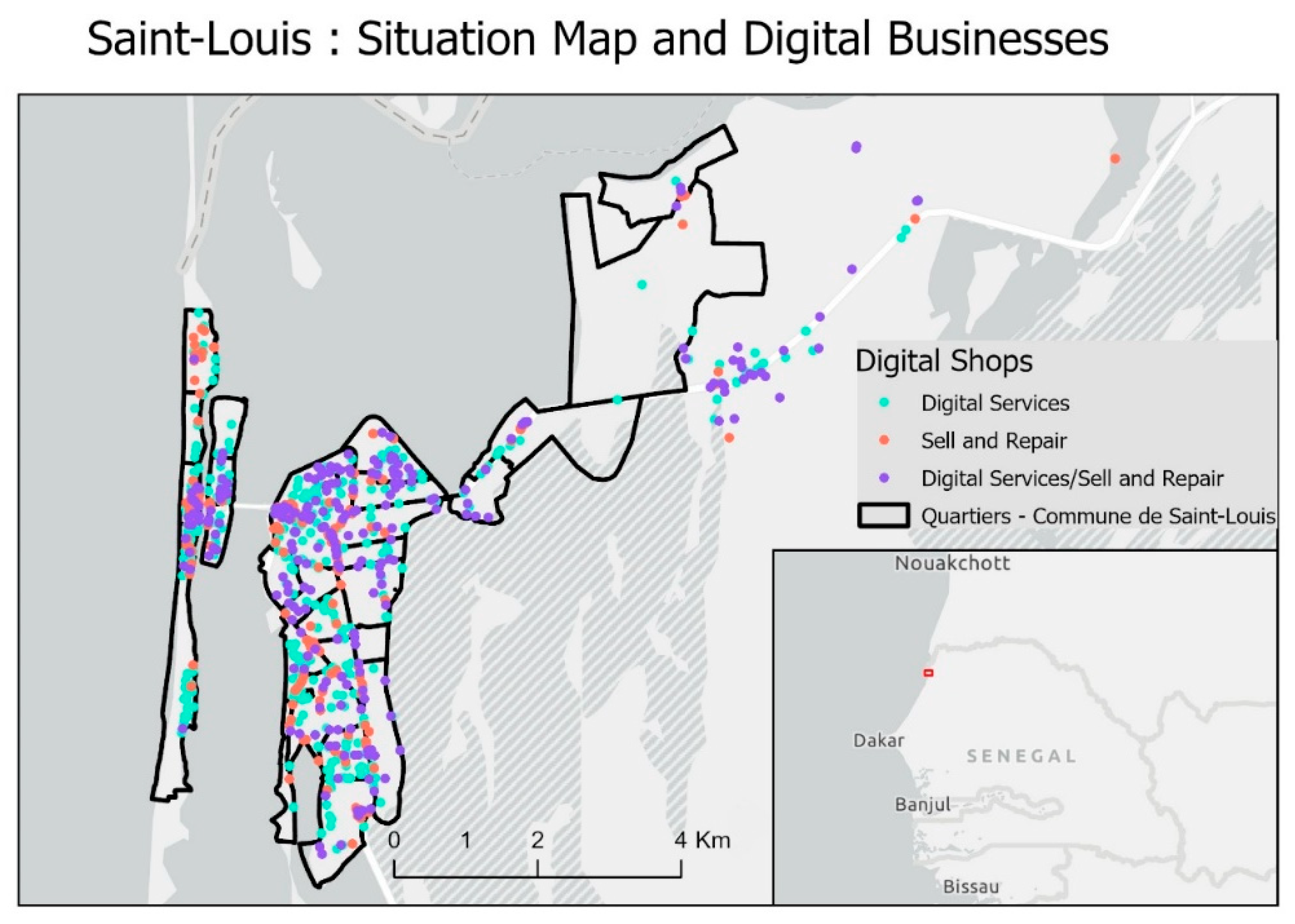 - Sow, D.; Adjanohoun, D.; Mbengue, T.; Wade, C.S.; Seye, M.R.; Mbaye, D.; Ndiaye, M.; Diallo, M.; De Roulet, P.; Munyagua, J.C.; et al. Jeunes et fractures numériques à Saint-Louis (Sénégal): Entre inégalités territoriales, vulnérabilités sociales et dynamiques d’adaptation. Rev. Ivoirienne Géographie Savanes 2025, 18, 677–690. [Google Scholar]