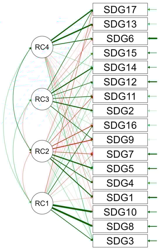 Analyzing the relationships between thematic factors and SDGs, RC1 shows strong positive connections with goals such as SDG1 (no poverty) and SDG10 (reduced inequalities). This suggests that activities or priorities within RC1 significantly contribute to reducing economic and social disparities. Additionally, RC1 has more limited or less intense relationships with other SDGs, indicating a focused impact. In the case of RC2 and RC3, the relationships are more complex, including both positive contributions and conflicts. For instance, RC2 exhibits negative interactions with SDG7 (affordable and clean energy), which may signal adverse impacts or challenges in balancing sustainable energy priorities. Conversely, RC2 shows notable positive contributions to other SDGs, such as SDG9 (industry, innovation, and infrastructure), reflecting a focus on technological development. RC4 stands out with predominantly positive relationships, making significant contributions to SDG17 (partnerships for the goals) and SDG13 (climate action). This highlights its crucial role in fostering international collaboration and addressing climate change.