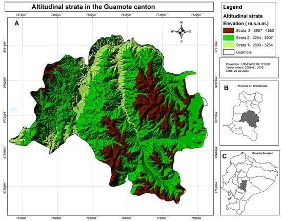 Study area and altitudinal strata. (A) Map of the Canton of Guamote: this represents the internal territorial distribution of the Canton of Guamote, highlighting its main geographical characteristics, altitudinal strata, and boundaries. (B) Location in relation to the province of Chimborazo: this illustrates the geographical location of the Guamote Canton within the province of Chimborazo, providing a regional context within the framework of its political–administrative division. (C) Location in relation to the country of Ecuador: this shows the position of the Guamote Canton within the Ecuadorian national territory, framing it in its geographical and political context at the national level.