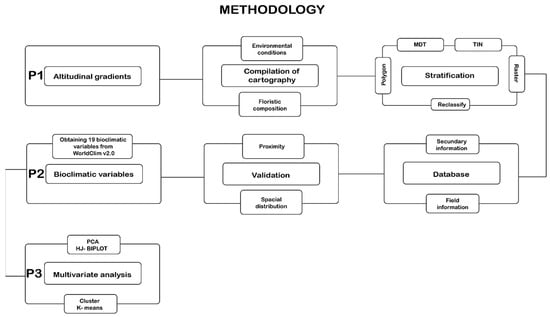 This study was developed under a quasi-experimental relational approach, using three altitudinal gradients as natural laboratories to evaluate the impact of geomorphological factors on ecology, biodiversity, and ecosystem dynamics. This approach allows for the analysis of species distribution responses to climatic variations, providing a basis for assessing plant richness and conservation value in mountain landscapes [19,20,21]. The methodological process was structured in three phases as follows (Figure 2):