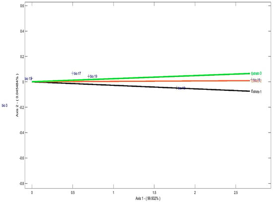 The first principal component explains 72.9% of the variance of the data, the second component 20.6%, and the third principal component 6.4%. It should also be considered that stratum 2 has a high contribution to the component analysis or axis 1, stratum 3 has a moderate contribution, and stratum 1 has a low degree of contribution (Figure 4).