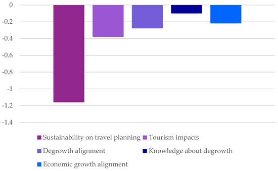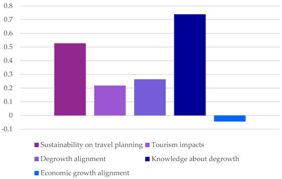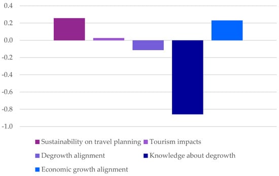 Factor 4 (knowledge about degrowth) assesses tourists’ awareness of degrowth concepts, a crucial element in understanding sustainable behavior. Research [4,12] has highlighted the significance of degrowth awareness for adopting related behaviors, reinforcing the relevance of this factor. Including these variables allows us to evaluate whether tourists’ actions correspond with their level of knowledge about degrowth.