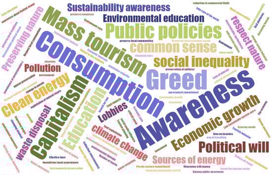 Following the degrowth questions, an open-ended question sought to identify what tourists perceive as the most significant global challenges for sustainable tourism, with the goal of exploring whether degrowth offers solutions to any of these challenges.