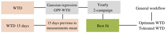 The models are used with the chamber flux measurements of GPP (NEE-Reco) for parametrising the campaign’s fixed variables: GPmax, α, and θ. The sole exception occurs with the WTD-based model where a previous step is required (Figure 3, Equation (7)), as earlier described. A general workflow is followed, and the best fit for every single model is selected for the two campaign moving windows (Figure 4).
