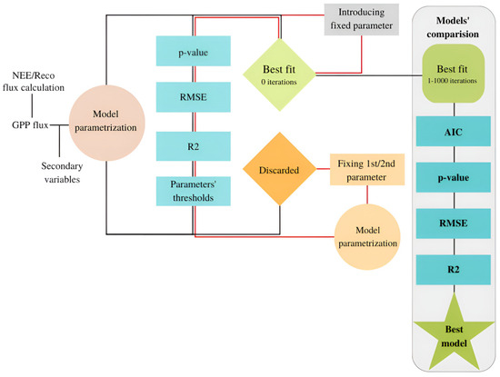 Algorithm workflow to choose the best fit for each model and the best model out of them. Net ecosystem exchange (NEE) and ecosystem respiration (Reco) fluxes are the fluxes calculated from manual chamber campaigns following the Hoffmann et al. approach [7].