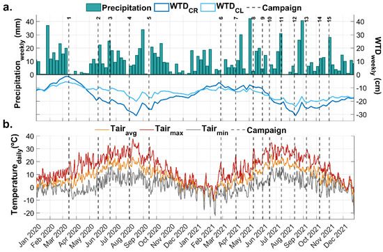 Hydrometeorological conditions for CR and CL sites in the Rzecin peatland during 2020–2021. Conditions are presented in a weekly timestep for the averaged water table depth (WTD) and cumulative precipitation (a) and in daily timesteps for air temperature (b). Dashed lines indicate dates of CO2 chamber campaigns (from 1 to 5 in 2020 and from 6 to 16 in 2021).