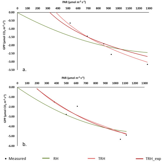 The light response curve of photosynthesis with the Michaelis–Menten rectangular hyperbolic approach (RH) and the modified RH with temperature factors (TRH, TRH_exp) for the first campaigns of the year (25 February and 31 March) in CL_3 (a) and CR_2 (b) plots.