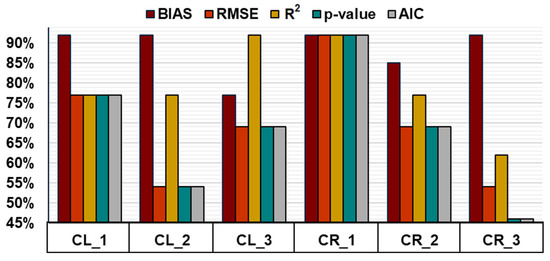 Percentage of 2020/21 campaigns in which including one of the temperature factors benefited the statistical results or resulted in an equally precise output. In the case of BIAS, RMSE, p-value, and AIC, a benefit is considered when the addition of temperature factor decreases these values and, in the case of R2, when it increases them. Statistics are shown for each plot of the CL (1–3) and CR (1–3) sites.
