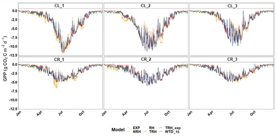 Modelled diurnal rates of gross primary productivity (GPP) for each plot of CL (1–3) and CR (1–3) sites for 2021 for all compared models; GPP is expressed in daily cumulative values (g CO2 m−2 d−1). Note that the GPP models abreviations stand for EXP—exponential model [21], NRH—non-rectangular hyperbolic model [20], RH—rectangular hyperbolic model, TRH and TRH_exp—linear and exponential temperature adjusted RH, and WTD_15—water table depth based model [22].