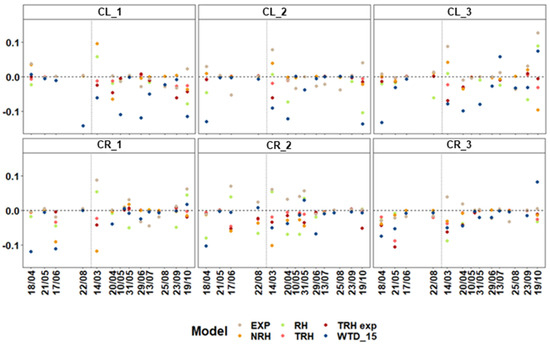 Additionally, half of them underestimated the measurements during the first campaigns of the year (WTD, NRH, and EXP—18 April 2021, and RH, NRH, and EXP—14 March 2021, Figure 9). In the case of CR sites, the patterns are not that clear, though generally, the measured GPP values are overestimated except in the exponential model. The exponential model shows the underestimation of GPP during the first half of the measurement season and their overestimation during the next half. In this case, the first campaigns of the year are only underestimated by the NRH and EXP models in CR_1 and CR_2 and only by the EXP model in CR_3. Overall, modelled values in CR and CL sites show errors below ±10% (±0.1, Figure 9). Other statistics, such as R2, follow the same trend where the year’s first and last campaigns show the lowest correlations (Supplementary Table S3), possibly due to lower vegetation productivity and cold temperatures effect plus a lower number of measurements per campaign.