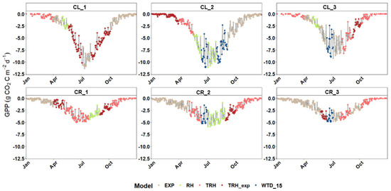 Modelled diurnal rates of gross primary productivity (GPP) for each plot of CL (1–3) and CR (1–3) sites for 2021 determined based on the multi-model approach; GPP is expressed in daily cumulative values (g CO2 m−2 d−1). Note that the GPP models abreviations stand for EXP—exponential model [21], NRH—non-rectangular hyperbolic model [20], RH—rectangular hyperbolic model, TRH and TRH_exp—linear and exponential temperature adjusted RH, and WTD_15—water table depth based model [22].