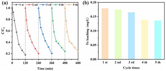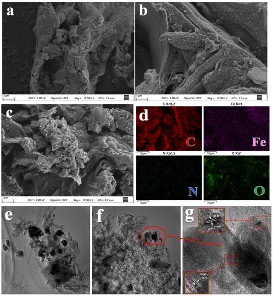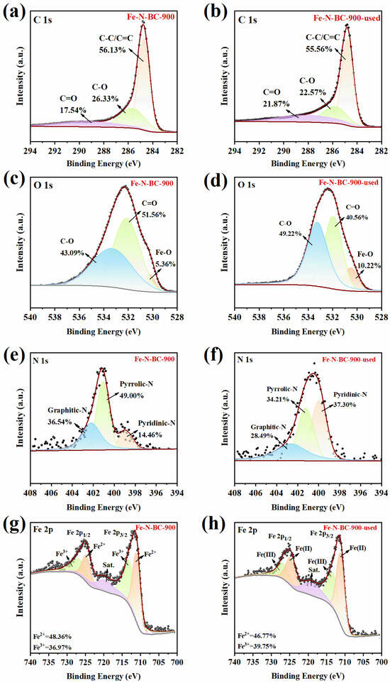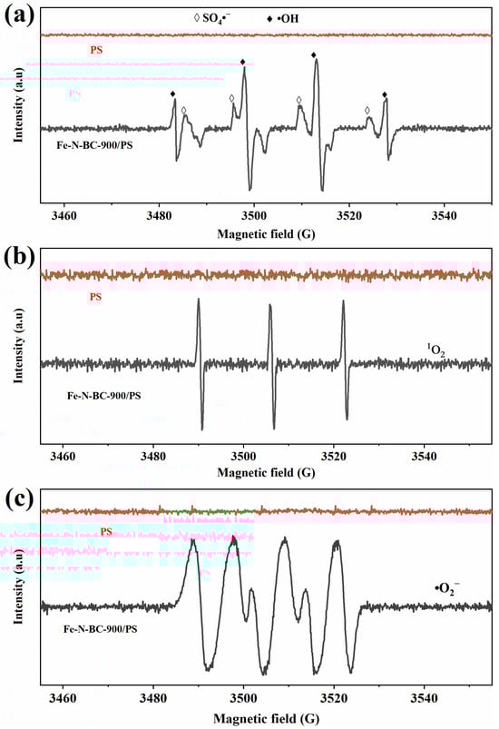 - After Fe doping, Fe2O3 and Fe3O4 generated on the biochar could be used as redox mediators to activate the PS to produce free radicals, such as SO4·−, ·OH, and ·O2− (Formulas (3)–(5)) [68]. These free radicals could effectively decompose TC in wastewater. It is noteworthy that the high TC removal efficiency of Fe-N-BC prepared at high temperatures might be mainly attributed to the attachment of a large number of Fe oxides (Fe2O3 and Fe3O4) on its surface, promoting the release of more free radicals (Figure 2a and Figure 4).