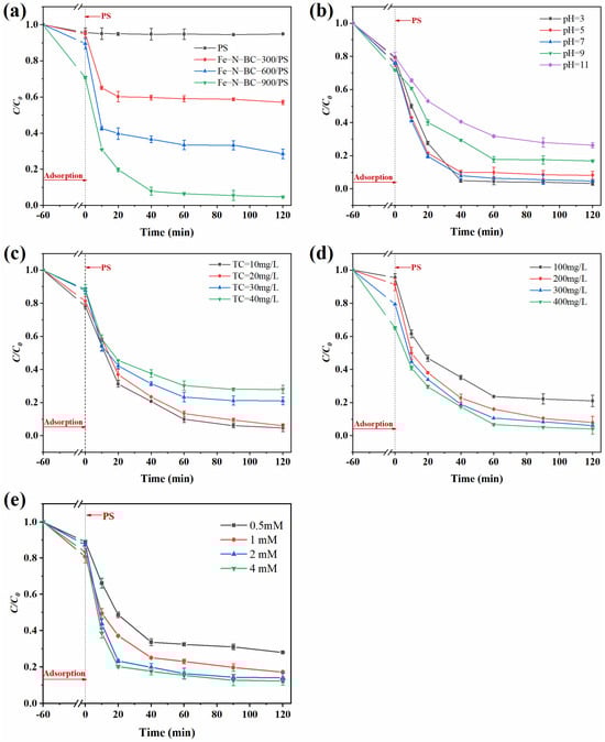 - Fe-N-BC could adsorb TC through the complexation of oxygenated functional groups (e.g., C-O, Fe-O, and C=O), and the large specific surface area of the catalyst prepared at a high temperature provided more binding sites for TC adsorption.