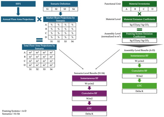 To project the differential climate impact of the four framing systems, the scope of the analysis was limited to the product stage as reported in LCA Modules A1–A3. Limiting the system boundary to raw material acquisition and manufacturing (A1–A3) allowed the analysis to concentrate on the significant differences in the upfront embodied carbon of each framing system with the goal of analyzing their comparative carbon footprints through four scenarios of varied market adoption. The analysis was completed in the following four steps.