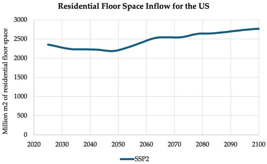 The projections of different market adoption scenarios were completed in three steps. First, a baseline projection of market-wide net new US residential construction was projected in the context of one of the Shared Socio-Economic Pathways (SSPs), which are scenarios that describe possible future socioeconomic developments and their implications for climate change [38]. “SSP2: Middle of the Road” was chosen to represent the path for population, gross domestic product, and baseline aggregate floor area between 2025 and 2100 [32]. Figure 2 shows that the net annual inflow of residential floor space will increase from approximately 2.4 million m2 in 2025 to almost 2.8 million m2 in 2100.