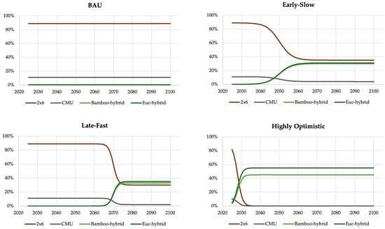 BAU was specified to represent no change in present market shares of the two traditional framing systems. This scenario represents a ”business as usual” environment with zero adoption of fast-growing biogenic framing materials. Early-Slow specifies early adoption of the fast-growing biogenic framing materials, starting in 2029 and occurring at a relatively slow growth rate of 0.3 annually. This scenario recognizes the presence of in-market, fast-growing biogenic building materials such as those from BamCore (the seller of the two hybrid framing systems used in this analysis), Plantd, Hempitecture, and others. Late-Fast specifies delayed adoption of the fast-growing biogenic building materials, starting in 2062 and growing at 0.8 annually. This scenario represents a catch-up environment where accelerating climate change and activated tipping points motivate later but intense adoption. Highly Optimistic specifies very early and complete adoption of the fast-growing biogenic building materials, starting in 2025 with immediate market share of 4–5% and occurring at a growth rate of 0.8 annually. While this last scenario is highly implausible, it illustrates the extreme adoption that is required for the durable storage of biogenic carbon in US residential building frames to reach a level of decarbonization that contributes to a reduction in projected lowered Global Temperature Change (GTC) (i.e., net cooling) before 2100. Adoption rates across the non-BAU scenarios are indicative of prior adoption rates reported for renewable energy sources [39]. Table S3 reports the full set of parameters driving each scenario.