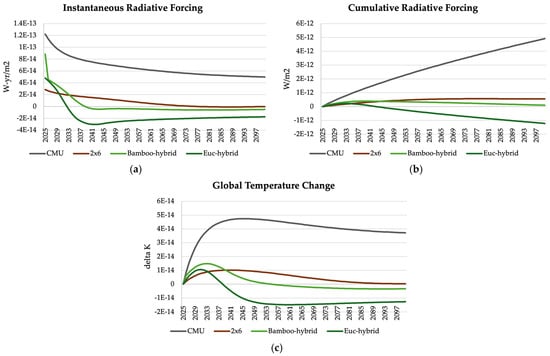 In contrast to the above dynamic LCA, a static LCA conducted on the framing systems would provide a much simpler viewpoint. If the cradle-to-gate analysis considered carbon emissions vs. uptake balance, the total impact would be valued in the Total Embodied Carbon column minus the values in the Total Biogenic Carbon columns in Table 1. This analysis would yield the following results: 65.5 kg CO2eq/m2 for CMU, 1.8 kg CO2eq/m2 for 2 × 6, −5 kg CO2eq/m2 for the bamboo-hybrid, and −29 kg CO2eq/m2 for the Euc-hybrid. The limitations of this approach compared to the dynamic LCA results are apparent. First, no timing-related insights can be drawn from these results. The static LCA produces an incomplete projection of the climate impact at the end of the analysis period, but no visibility into what was occurring throughout the analysis period. The two fast-growing fiber-based framing systems are projected to end with negative values, but at what point in time does this happen? Second, the kg CO2eq unit of measure does not give any insight into climate-related targets set forth in the Paris Agreement, which are set in terms of Global Temperature Change. One may surmise that a negative value is a good thing, but the translation to degrees of cooling is unclear.