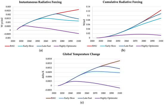 (a) Instantaneous Radiative Forcing; (b) Cumulative Radiative Forcing; and (c) Global Temperature of the four framing systems in the US between 2025 and 2100 for the four adoption scenarios considered.