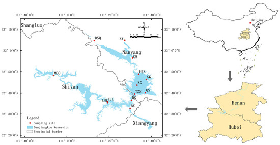 The Danjiangkou reservoir (32°56′~32°82′ N, 111°39′~111°61′ E) is located in central China between Danjiangkou City, Hubei Province, and Xichuan County, Henan Province. It is Asia’s largest artificial freshwater lake. The reservoir is V-shaped, consisting of two parts, Hanku and Danku, with a total water area of about 1050 Km2 and a total capacity of 290.5 × 108 m3. Taking into account the varying degrees of influence from human activities and the unique geographic location characteristics of the Danjiangkou reservoir, along with the long-term monitoring of water quality and ecological conditions within the reservoir area, a comprehensive sampling strategy was devised, resulting in the establishment of a total of 14 sampling points, A total of 8 sampling points were established in Danku (Dashiqiao (DSQ), Zhangying (ZY), Caowan (CW), Heijizui (HJZ), Songgang (SG), Kuxin (KX), Taizishan (TZS), and Qushou (QS), of which DSQ and ZY are located at the inlet of Danku, and QS is located in the intake point of the SNWDP) and 5 sampling sites were established in Hanku (BS, LHK, TJL, MGC and GJC, of which LHK and MGC are located at the intake of Hanku). Another sampling site was set up 100 m downstream of the outlet of the Danjiangkou Dam: Baxia (BX) (Figure 1). Note that the 14 sampling points were all far from shore or located at the corner of the lake to avoid disturbance from human activities. The GPS information of each sampling point is provided in Supplementary Data S1.
