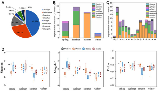 Planktonic algae, as the source of oxygen and food for all other life forms, play essential roles in aquatic ecosystems [1]. The community structure, species composition, and seasonal variations in phytoplankton exhibit exceptionally close correlations with water quality, significantly impacting the energy and material cycles within aquatic ecosystems [2]. Apart from its crucial function in sustaining these ecosystems, phytoplankton also responds most directly to alterations in the aquatic environment [3]. Consequently, phytoplankton occupies a pivotal role in monitoring water quality [4]. In eutrophic water bodies, the dynamics of phytoplankton are significantly affected, as nutrients such as nitrogen and phosphorus provide abundant sources of nourishment for their growth [5]. Phytoplankton utilize these nutrients for photosynthesis and metabolism, thereby accelerating their growth and reproduction rates, which alters the community structure and dynamic processes of phytoplankton. Additionally, excessive growth of phytoplankton can lead to over-proliferation, resulting in an imbalance in the biological community structure of the water body [6]. In freshwater ecosystems, phytoplankton overgrowth can lead to the deterioration of water quality and affect biodiversity, which, in turn, affects biomes [7]. At present, studies on phytoplankton in freshwater reservoirs start with the detection of plankton and physicochemical indexes and then begin to develop correlations between the phytoplankton and environmental factors [8].