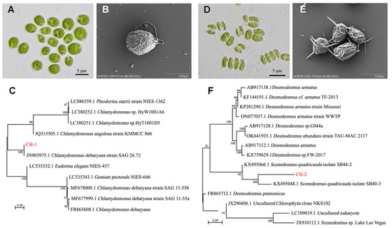 The algae in the Danjiangkou reservoir were collected. Two strains, named CH−1 and CH−2, were isolated and cultured indoors. CH−1 displayed a unicellular, spherical, or ovate shape, with dimensions varying between 2.7 and 8.37 μm in length and between 2.17 and 7.8 μm in width. At the anterior end of the cells, two equal-length flagella were present, with the telescopic vesicles located at their bases. Additionally, near the anterior end of the cells, red eyespots were visible. Upon examination, large cup-shaped chromoplasts and amyloid nuclei were observed within the cells (Figure 4A,B). The CH−2 cells exhibited a spindle-shaped or oblong morphology, with dimensions ranging from 3.6 to 5.7 μm in length and from 2.1 to 4.1 μm in width. Predominantly, these cells occurred as singles, but they could also be found in groups of two or four. Inside the cells, lamellar or cup-shaped chromatophores were abundant, accompanied by one or two pyrenoids. Spines were visible at the upper and lower ends of the cell’s outer surface (Figure 4D). The cell wall was characterized by granules, spines, or elevated lines (Figure 4D,E). The 18S rDNA analysis showed that CH−1 was in a clustered branch with 100% self-expansion support with the Chlamydomonas debaryana strain SAG26.72, indicating that CH−1 was close to C. debaryana (Figure 4C). The Scenedesmus quadricauda isolate SB40-3 was clustered into a single unit with 100% self-expansion support with CH−2, suggesting that CH−2 was the closest relative to S. quadricauda (Figure 4C). Based on the cell morphology observations and molecular comparison, the dominant algal species CH−1 and CH−2 were identified as C. debaryana and S. quadricauda, respectively.