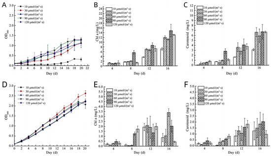 The growth of C. debaryana was strongly affected by light intensity. In the light intensity range from 10 to 90 μmol/(m2·s), the growth of C. debaryana intensified with the increase in light intensity, and the concentrations of Chl a, and Car were increased (Figure 6A–C). The growth of S. quadricauda showed the same behavior at different light intensities, and the maximum growth was obtained at 30 μmol/(m2·s) (Figure 6D–F).