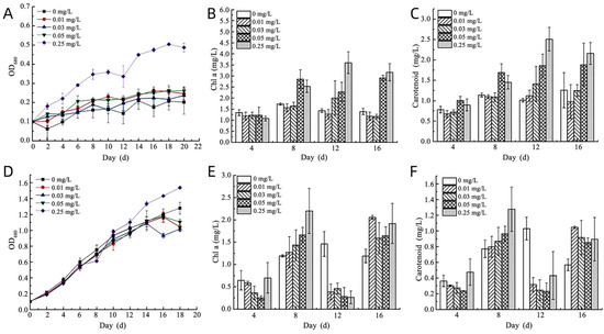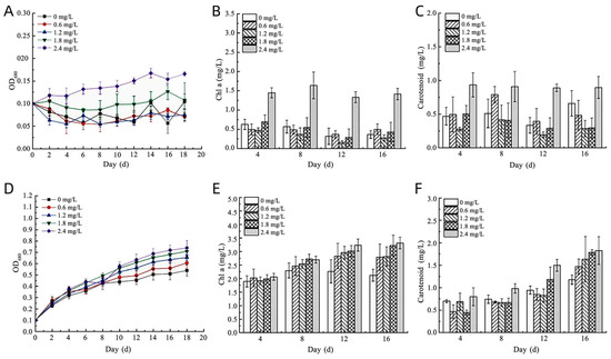 Effects of nitrogen on the growth behavior of C. debaryana and S. quadricauda. The cell density OD 680 (A,D), The content of Chl a (B,E), The content of Carotenoid (C,F). The quantitative data are presented as the means ± S.Ds. (n = 3).
