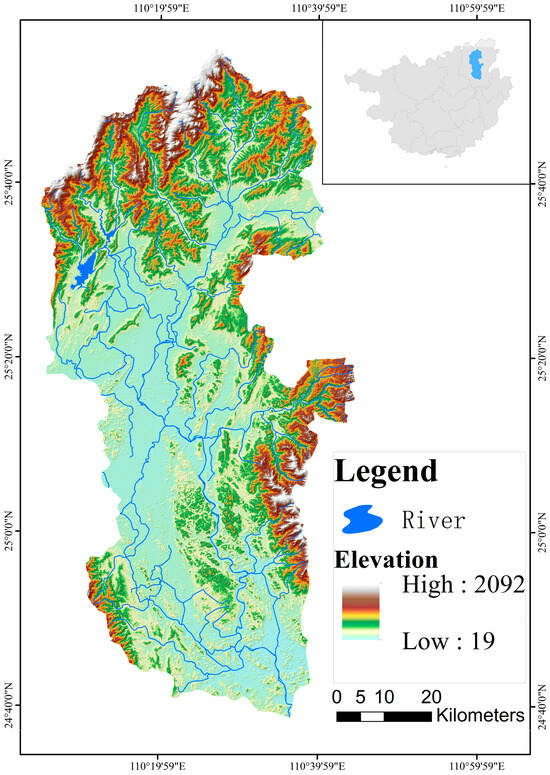 The research region selected for this study is the Lijiang River Basin (LRB), located in Guilin City, within the Guangxi Zhuang Autonomous Region of China, as depicted in Figure 1. The LRB is a typical karst landform scenic area [16] within the subtropical humid monsoon climate region in South and Central Asia, with a vegetation coverage rate of approximately 62.0%, encompassing all vegetation types found within the central subtropical regions of China [17]. As global issues, the restoration and management of the fragile karst environment have continually been topics focused upon by relevant scholars [18]. The ecological environment has a lasting influence on the development of urban tourism [19], as the LRB is the essence of Guilin’s tourism resources. Therefore, taking the LRB as an example, the monitoring and assessment of its EEQ hold crucial practical implications for the sustainable growth of both its ecological and tourism sectors.