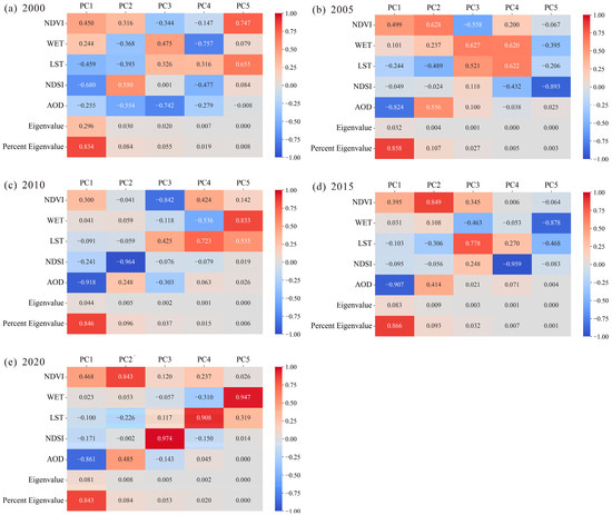 Principal component analysis of the NDVI, WET, LST, NDSI, and AOD in 2000 (a), 2005 (b), 2010 (c), 2015 (d), and 2020 (e).