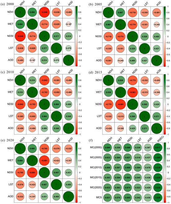 The correlation coefficient matrix among the NDVI, WET, NDSI, LST, and AOD in 2000 (a), 2005 (b), 2010 (c), 2015 (d), and 2020 (e); the correlation coefficient matrix of the average correlation between the NDVI, WET, NDSI, LST, and AOD and the remote sensing ecological comprehensive index (RSECI) (f). NOTE: MC represents the mean correlation; MC5 represents the five-year mean correlation degree.